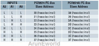 - PCF8574A Address range (0x38 to 0x3F – up-to 8 device)